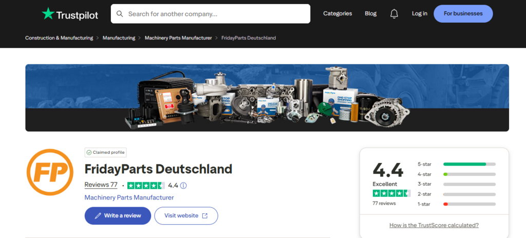 Auf Trustpilot Deutschland wird FridayParts Deutschland Webseite mit 4,4 von 5 Sternen bewertet, basierend auf 77 Bewertungen. Die Gesamtbewertung lautet „Sehr gut“. Viele Kunden loben insbesondere das Preis‑Leistungs‑Verhältnis, die Verfügbarkeit spezieller Ersatzteile sowie eine insgesamt zuverlässige Bestellabwicklung.